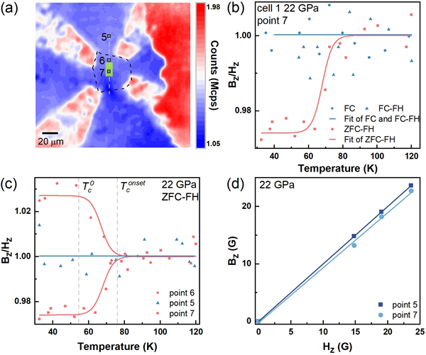 近期,中国科学院合肥物质科学研究院固体所计算物理与量子材料研究部刘晓迪研究员团队联合吉林大学黄晓丽教授团队、中山大学王猛教授团队利用金刚石氮-空位(Nitrogen vacancy, NV)色心以及电输运手段在高压下的镧镍氧(La3Ni2O7−δ)单晶材料中同步观测到超导零电阻和迈斯纳效应,证实了镧镍氧材料的超导抗磁性,为这类高温超导材料的研究提供了坚实的实验证据。相关结果以“Evidence for the Meissner effect in the nickelate superconductor La3Ni2O7−δ single crystal using diamond quantum sensors”为题发表在Physical Review Letters ( Phys. Rev. Lett., 2025, 135, 096001 )上。